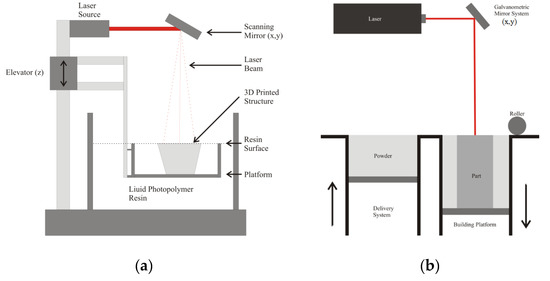 The initial idea of stereolithography (SLA) was developed in 1980 by a Japanese researcher, Hideo Kodama, at the Nagoya Municipal Industrial Research [43]. It was improved by Charles Hull in 1984 by using the concept of a hardened process that implemented some liquid polymers using UV light [44]. Further improvements were then made by Carl Decard with the use of a laser beam and through the solidification of powder material, thereby known as selective laser sintering (SLS) [45]. Figure 3 illustrates the SLA and SLS systems accordingly.