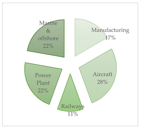 Figure 5 shows the types of industry in which AM has been deployed for component repair and restoration. The highest utilization of AM for repair and restoration is in the aircraft industry due to the need for cost reduction and ultimately, business continuity [59]. Publications related to the aircraft industry were found to make up 28% of the total (five publications), followed by 22% (four publications) for the power plant industry and marine and offshore industries each, 17% (three publications) in the manufacturing industry, and 11% (two publications) in the railway industry.