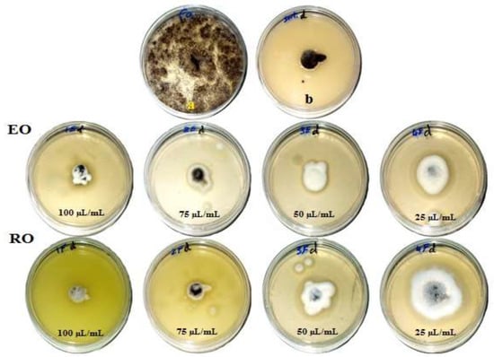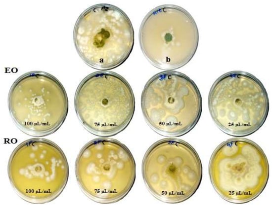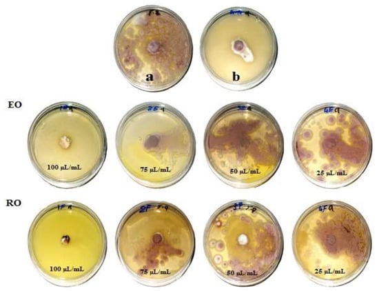 Visual observation of the antifungal activities of essential (EO) and recovery (RO) oils from M. chamomilla (fresh flowers) against the growth of Aspergillus flavus. (a) Negative control (0 µL/mL); (b) Positive control (Sertaconazol 3 g/L).