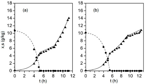 Biomass (solid triangles) and glucose (solid circles) concentrations measured during two fed-batch cultivations (subplots (a) and (b), respectively), along with the corresponding model outputs (solid line and dashed line), determined from Equations (1)–(9).