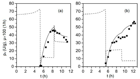 Specific concentration of viral capsid protein VP1, px (solid squares) obtained from two fed-batch cultivations (subplots (a) and (b), respectively), along with the corresponding model outputs (solid line) and the biomass specific growth rate, μ (dashed line), determined from Equations (1)–(9).