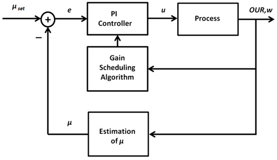 Because of the nonlinear and non-stationary behavior of the investigated biotechnological processes, application of the ordinary PID control algorithm is limited. Depending on the operating point of the system, the dynamic response (that is defined by varying resultant gain and time constants) of the controlled process may vary, thus requiring corresponding changes of the controller tuning parameters. Such an adaptation of the parameters is required to meet the control quality and stability requirements. As an alternative to the ordinary PID control algorithm, adaptive control techniques may be applied. A promising approach is the gain scheduling technique that implies an application of additional online measurements and construction of the functional relationships used for adaptation of the controller parameters. To identify such relationships, a detailed insight into the dynamic properties of the controlled process is required. For this purpose, a part of Equations (1)–(9) will be transformed to explicit the relationship between the control variable u (substrate feeding rate) and the process variable μ (biomass specific growth rate, SGR). The latter will be controlled in a closed-loop mode. As the SGR is not directly measurable online, one needs to use an auxiliary variable and a state estimator to calculate the signal required for the feedback loop. After analyzing the process model, the oxygen uptake rate OUR was selected as a suitable additional variable, as it adequately reflects the physiologic state of the culture, is well correlated with the biomass growth rate, and can be precisely measured in a bioreactor-scale cultivation process. The structure of the proposed adaptive PID control system is shown in Figure 3.