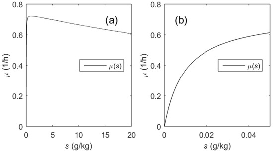 µ(s) kinetics (Equation (5)): Possible range of s concentrations in the cultivation medium (a), effective range of s concentrations (b) during µ control by means of substrate limitation.