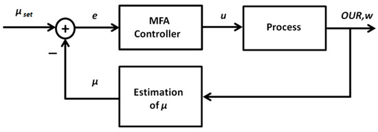 It is important to stress that despite the adaptation rules (21) and (22) being based on the OUR and w signals, the adaptive closed-loop control system still needs the feedback signal of the specific growth rate µ (see Figure 3). As this process variable is not directly measured online, an estimator based on the online measurable signals needs to be developed. A logical and straightforward solution is to make use of the OUR signal that is already used for the adaptation of the controller tuning parameters in Equations (21) and (22).