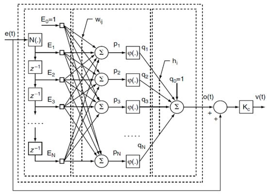 where n is the nth iteration of the discrete-time control system; pj(n) is the input of the jth activation function in the hidden layer; wij(n) is the ijth weight in the hidden layer; Ei(n) is the ith error signal; qj(n) is the output of the jth activation function in the hidden layer; o(n) is the output of the output layer; hj(n) is the jth weight of the output layer; o(t) is the continuous function of o(n); e(t) is the continuous error signal function; KC is the controller gain coefficient; and v(t) is the continuous function of the controller output (control variable).
