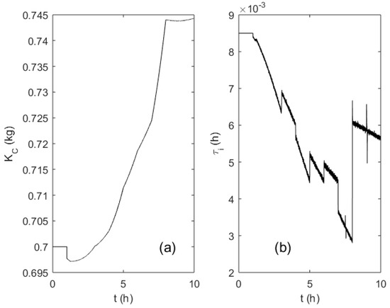 Figure 10a,b depicts the adaptation trajectories of the PI controller parameters KC and τi, respectively. The variation span of the controller gain KC did not exceed 10%, as the parameter is proportional to the culture broth weight that changed moderately during the process. Integration time constant τi follows the changes of the OUR profile and; therefore, reflects the significantly varying dynamics of the process.