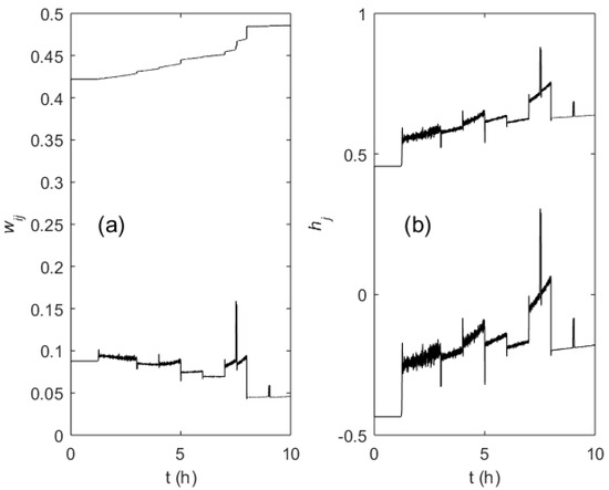 Evolution of the ANN weights wij (a) and hj (b) during the fed-batch process (one node in the hidden layer and one node in the output layer used).
