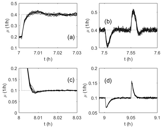 Both investigated control algorithms were tested under various conditions that affected the control quality. During the tests, the variance of the additive white Gaussian noise was varied from 0 to 0.05. An adaptation/learning iteration was performed every time new data were received by the controllers. The discrete-time control algorithms were tested with a feedback signal sampling interval ranging from 1 to 15 s. These values correspond to the realistic intervals used in bioreactor control systems. The control performance results for both controllers, obtained with 0.005 variance and 5 s sampling interval, are depicted in Figure 9. The plots show transient processes that were caused by setpoint changes (Figure 9a,c) and by disturbance (Figure 9b,d). The disturbance was a temporary reduction of the substrate feeding pump performance by 50%. As it can be seen from the plots, both controllers deliver comparable control quality. Calculation of IAE error for each process revealed that the differences between the control quality of the investigated controllers did not exceed 5%–10%. Neither of the two controllers demonstrated a clear advantage. The adaptive PI controller tended to perform better under high SGR conditions, and the MFA controller resulted in lower tracking error when operating under low SGR conditions. In the investigated simulation runs, the average tracking error did not exceed 0.01 (1/h). The temporary overshoots caused by the maximal disturbances stayed within the range of 0.025–0.11 (1/h).