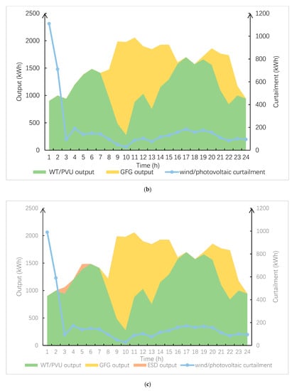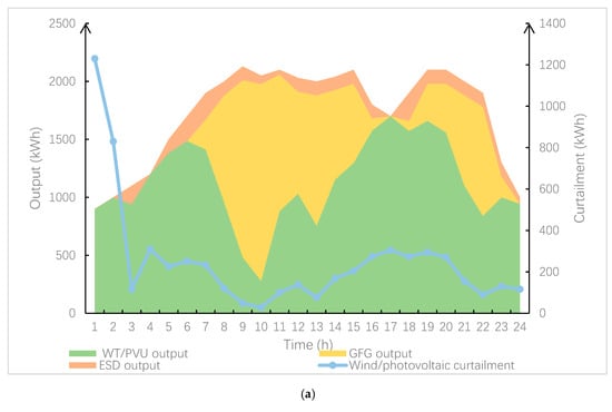 WT, PVU, GFG, and ESD were the units providing power. The power output of PGST was in the form of gas-fired power generation. Figure 3 shows the output of different types of equipment in each scenario, and Table 7 shows the clean energy curtailment rates of different scenarios. The results indicate that the available outputs of the WT and PVU were basically the same in different scenarios, but the wind/photovoltaic curtailment differed accordingly. The curtailment rate in the S1 was the highest, reaching 16.70%, whereas when the PGST was employed, the curtailment rate decreased (12.37% in S2), as did the GFG output. Moreover, in the scenario where both the PGST and ESD were employed, because of the different priorities of using the two devices, different results occurred for the wind/photovoltaic curtailment and the GFG output. The curtailment rate in S3 decreased to 11.59% compared with that in S2, but that in S4 decreased more—11.18%. Thus, the method of ‘energy storage preferentially, then gas storage’ has the best effect on reducing wind/photovoltaic curtailment.