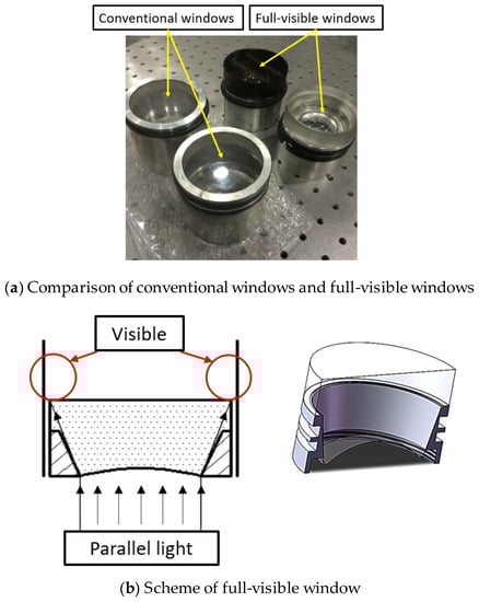 Figure 1a shows a comparison of conventional piston windows and full-visible piston windows with the size same as the bore diameter (75 mm). The top of the full-visible window is flat, while the bottom is a curved surface to enlarge the visible area. The design principle for the curved surface is so that when parallel light comes from the bottom of the window, it can reach all the areas inside the combustion chamber, as shown in Figure 1b. According to the reversibility of the light path, the combustion chamber is fully visible when observed from the bottom of the full-visible window. The image distortion brought by the curved surface can be corrected by a coordinate transformation. The correction method is detailed in [].
