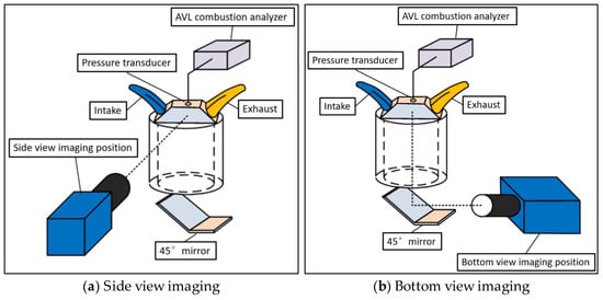 Figure 2a,b illustrates the experiment schema of a side view and bottom view image acquisition respectively. Bottom view images were taken by a Photron SA-X2 high-speed camera via the 45° mirror and the quartz window on the piston crown. The side view images were taken by a Phantom V710 high-speed camera through a fused silica window placed at the side of the combustion chamber. The in-cylinder pressure was recorded by the pressure transducer and combustion analyzer. The air–fuel ratio sensor, which was installed at the exhaust port, ensured that the engine always operated at an equivalence ratio of 1.0.