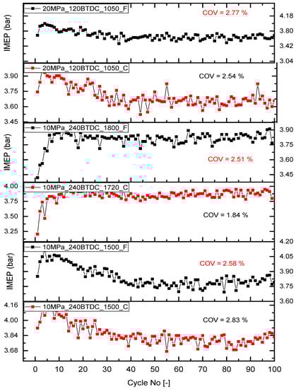 However, recent researchers employed this method to analyze the in-cylinder pressure of ICE and evaluate CCV. Many investigations engaged in studying the effect of various engine parameters integrate with alternative fuels on CCV [,,,]. Other studies have investigated into the influence of different CR, injection pressure, fuel additive, and engine load on CCV [,,,]. Maurya and Akhil [] found lower CCV for 200 bar of injection pressure compared to 170 and 220 bar using both statistical and wavelet methods. Law et al. [] discovered that at 2000 rpm engine speed, the spark timing has no impact on the ignition, combustion and IMEP within the range of 2–5 bar. However, gasoline direct injection (GDI) engines with stratified mixtures have large CCV and low combustion efficiency at low engine speeds and high loads [].