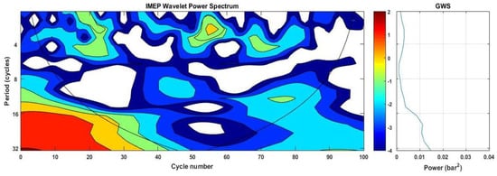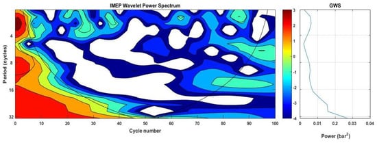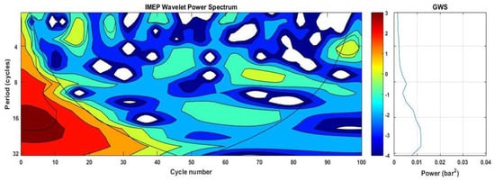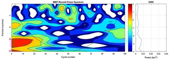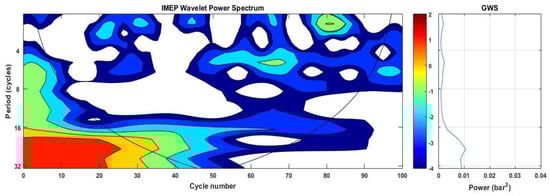 The technique of wavelet analysis has been used widely to investigate the variations within the series of collected data in different scientific applications []. It has been adopted to indicate the presence and persistence for specified periodicities. In this technique, the signal processing is adopted to distinguish information for time and frequency simultaneously. The task for localization of these two conjugate variables is complex due to the lack of a specified method for the specific value of frequency indication at a provided time and vice versa. Thus, the wavelet analysis technique could be implemented efficiently to obtain a powerful analysis for observations of decomposing time and frequency together []. The time series of the IMEP is considered as a base parameter for conducting the wavelet transform. This parameter can be considered a significant indicator for the in-cylinder pressure and fuel combustion progress. Wavelet transform is suitable to analyze the time series with fluctuated power and variable different frequencies []. It is used in this study to analyze the IMEP time series for 100 consecutive engine cycles at equal time spacing.