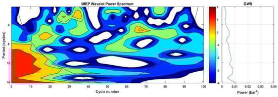Figure 4 illustrates the IMEP time series of the SI engine at different injection pressures, timings and durations under a clean and fouled injector. The cycle-by-cycle variation of IMEP near the best injection timing is strongly correlated to the cycle-by-cycle fluctuation of the concentration of unburned fuel existing at the cavity side during the later combustion period []. Huang et al. [] stated that cycle to cycle variation could be more clearly demonstrated in the CoVIMEP rather than in the maximum cylinder pressure CoVPmax. The WPS and GWS of each of these time series are illustrated in Figure 5, Figure 6, Figure 7, Figure 8, Figure 9 and Figure 10. The WPS is a contour plot that has the Fourier period on the y-axis and the cycles number (data series) on the x-axis in addition to the intensity of the variations in the data series expressed in the contour plot. The higher variation of the parameter is indicated by a stronger color in the contour plot.