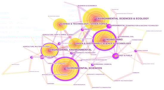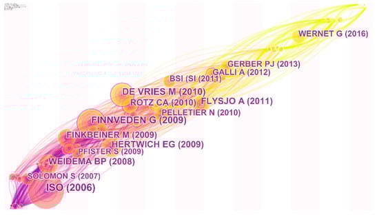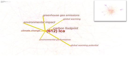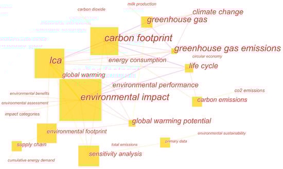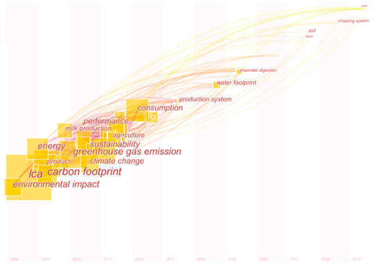 Figure 8. Most of the high-frequency keywords appeared in the early stages of research, such as the two keywords of this study, namely “LCA” and “carbon footprint”. In line with the analysis of noun terms, “environment impact” was the earliest high-frequency word and the origin and essence of the research in this field, i.e., how to adopt a proper LCA method in accordance with the carbon footprint concept to evaluate the environmental impact of an activity. In recent years, there were fewer new high-frequency keywords, some of which were “water footprint”, “anaerobic digestion” and “plant”. Their emergence indicates that the research in the field has become more extensive and in-depth. “Water footprint” is a horizontal extension of “carbon footprint”, which makes the measurement system more complete. “Plant” and “anaerobic digestion” is an upward and downward extension of the research respectively, with the former focusing on the important sources of carbon emissions and the later ways to improve the environment.