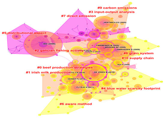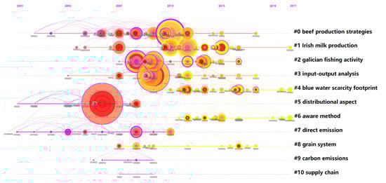 Figure 7. As can be seen from the distribution of major clusters along the time axis, beef production and dairy industry, as well as assessment method, are long-term topics in this kind of research. Topics of water footprint, aware method and grain system appeared in recent years.