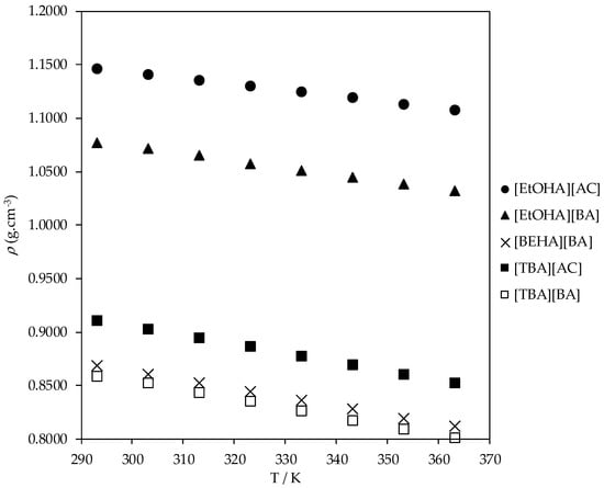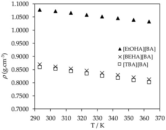 Plot of experimental density (ρ) values of [EtOHA][BA], [BEHA][BA], and [TBA][BA] as a function of temperature.