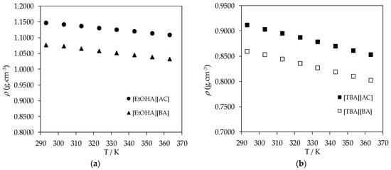 (a) Plot of experimental density (ρ) values of [EtOHA][AC] and [EtOHA][BA] and (b) plot of experimental density (ρ) values of [TBA][AC] and [TBA][BA] as a function of temperature.