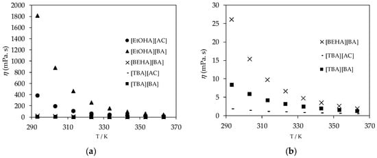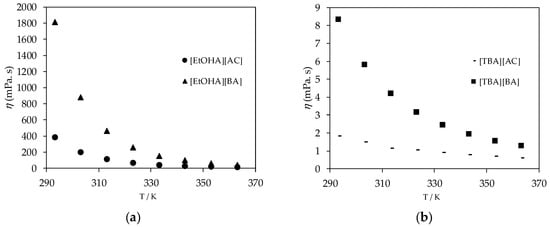 (a) plot of experimental viscosity (η) values of [EtOHA][AC] and [EtOHA][BA] ionic liquids and (b) plot of experimental viscosity (η) values of [TBA][AC] and [TBA][BA].