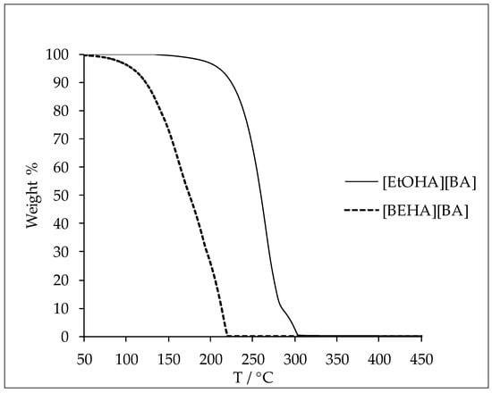 The thermal decomposition (Td) of the ammonium-based protic ionic liquids were measured at a heating rate of 10 °C·min‒1. The Td was approximately determined by the intersection of the baseline weight from the beginning of the measurement and the tangent of the weight against the temperature curve as the decomposition process occurs. The Td of the ionic liquids are presented in Table 8 and the thermal decomposition curves for [EtOHA][BA] and [BEHA][BA] are given in Figure 6. The thermal stability of the ammonium-based protic ionic liquids in this study varied with the ion combination. The Td of [BA] ionic liquid was higher than that of [AC] ionic liquid for every type of cation studied while [EtOHA] ionic liquids displayed the highest Td followed by [BEHA] and [TBA]. However, ammonium-based protic ionic liquids in this work and from the literature [36] tend to possess lower thermal stability compared to other ionic liquids, such as imidazolium and pyridinium ionic liquids [28,41,42]. However, generalization must not be made as the thermal stability depends largely on the combination of the cation and anion of the ionic liquids.
