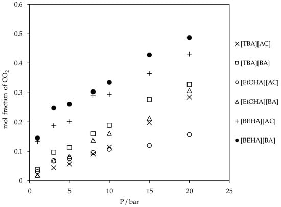 Plot of CO2 absorption in ammonium-based protic ionic liquids at 298.15 K.