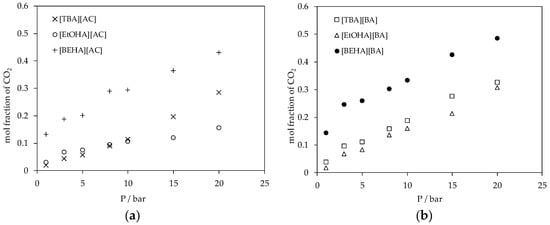 (a) Plot of CO2 absorption in ammonium-based protic ionic liquids with [AC] anion and (b) plot of CO2 absorption in ammonium-based protic ionic liquids with [BA] anion at 298.15 K.