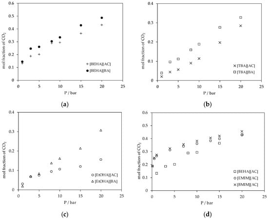 (a) Plot of CO2 absorption in ammonium-based protic ionic liquids with the [BEHA] cation; (b) plot of CO2 absorption in ammonium-based protic ionic liquids with the [TBA] cation; (c) plot of CO2 absorption in ammonium-based protic ionic liquids with the [EtOHA] cation and; and (d) plot of CO2 absorption in [BEHA][AC], [EMIM][AC] [45] and [BMIM][AC] [11] at 298.15 K.
