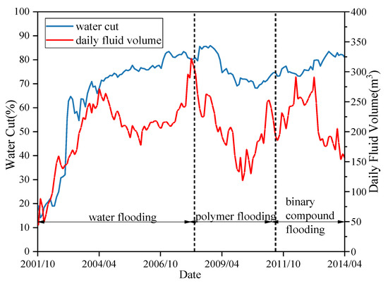 Excluding the influence of production factors, production well W1 was selected as the target well in this study, and the change curves of the moisture content and the daily fluid volume in the three phases of water flooding, polymer flooding, and binary compound flooding were obtained, as shown in Figure 2.