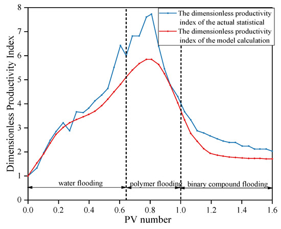 - In this study, we established a calculation model of the dimensionless productivity index suitable for the multiple development phases of oilfields, including water flooding, polymer flooding, and binary compound flooding, and we established an index suitable for medium and low permeability reservoirs. The calculation results of the dimensionless productivity index model were compared with the actual statistical results; the calculation error rate of the dimensionless productivity index for the three oilfield development phases were 4.67%, 17.65%, and 18.50%, respectively. The average error rate was 10.38% in the overall development phase.