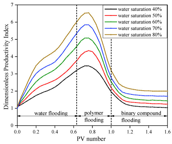 Using the dimensionless productivity index calculation model established in this paper, with Equations (18), (21), and (24), we calculated the dimensionless productivity index of the target production wells in the stages of water flooding, polymer flooding, and dual flooding in block W. Under different water saturations, the relationship between the dimensionless productivity index and the PV number was determined (Figure 4). At the same injection PV number, as the water saturation increases, the change range of the dimensionless productivity index is more drastic.