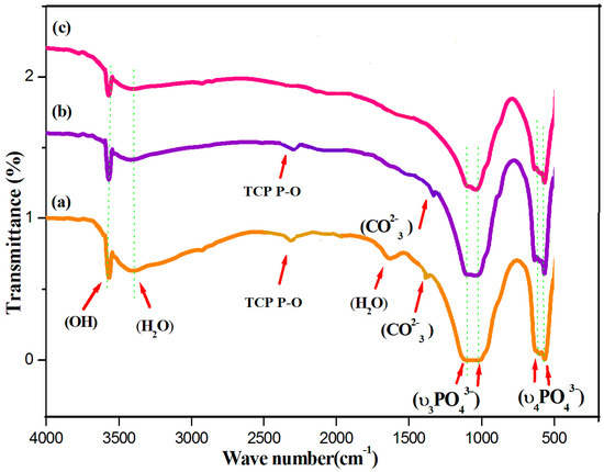 Fourier-transform infrared (FTIR) spectroscopy is an analytical technique generally used to describe the functional groups existing in biomaterials such as HAP, HAP-LA, and HAP-SA. The wide FTIR band centered around 1000–1100 cm−1 is the primary symbol of HA development [28] and represents the υ3 phosphate modes (Figure 2). The peaks found at 604 and 564 cm-1, resulting from the P-O band’s doubly degenerate bending mode (υ4). The broadband at 3550–3200 cm−1 implies the water absorbed by the lattice. The OH− is stretching, and vibrational bending modes appear at 3569 and 631 cm−1 [29]. The weak absorption bands at 1408, 1456 cm−1 were observed for samples HAP and HAP-LA as reported for carbonated HAP, which could result from the presence of atmospheric carbon dioxide during calcination processes [30,31]. The presence of TCP is also shown by the stretching frequency of the phosphate group at 2360 cm-1 [15] for the HAP and HAP-LA samples. Furthermore, the existence of TCP is also weakened, which is in coincidence with the XRD results. For HAP synthesized in the presence of SA, the HAP peaks were only detected without any other Ca-P impurities, as shown in Figure 1 and Figure 2, whereas, for samples HAP and HAP-LA, traces of TCP were confirmed. Thus, the conventionally prepared HAP was carbonated compared to those to HAP-SA. Also, the absence of C=O bands at 1760 cm−1 specifies the non-appearance of fatty acids in HA after sintering; thus the functional groups of LA or either SA are not incorporated in the sintered HA-HAP-LA or HAP-SA samples.