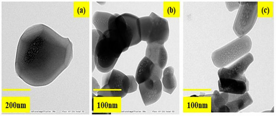 The HRTEM images of HAP synthesized without fatty acid shows larger particles of a 150–200 nm size and exhibit spherical particles as shown in Figure 4a–c. Whereas for HAP-LA, the particles were agglomerated and those of HAP-SA showed elongated particles. The shape, size, and length of nanorods of the sample HAP-SA are much enhanced compared to HAP and HAP-LA. Thus, it is found that the HAP-SA sample has a rod-like morphology without agglomeration, and a close look at the morphology of HAP-LA and HAP-SA samples shows poorly crystalline nanometer pores in nature. Many organic modifiers, such as citric acid, ethylenediamine tetraacetic acid, trisodium citrates, and vitamin C, were shown to control the size, shape, morphology, and pores of HAP particles during synthesis.
