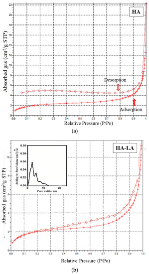 The mesoporous and microporous nature of samples HAP, HAP-LA and HAP-SA were analyzed based on the adsorption-desorption mechanism of nitrogen gas by BET analysis. Since nitrogen gas has the capacity to be adsorbed on the surface, it is used for the analysis of the surface area and porosity of pure HAP and HAP-LA and HAP-SA. The depth profile of pores was examined by the N2 adsorption and desorption isotherm method. The nature of the adsorption and desorption curves implies that they were not reversible, which leads to the appearance of hysteresis between the adsorption and desorption curves. Both the samples exhibited a type IV curve with a hysteresis loop that corresponds to a mesoporous material. The associated nitrogen adsorption–desorption isotherms and the resultant pore size distribution of HAP, HAP-LA, and HAP-SA are presented in Figure 5a–c. It is found that HAP synthesized by the conventional method does not show any mesoporous structure as the isotherm curve does not show closed hysteresis loop as shown in Figure 5a. While those synthesized with LA and SA (HAP-LA and HAP-SA) exhibit an average pore size of the order of 5.86 ± 0.0256 nm and 3.87 ± 0.0171 nm with the corresponding BET surface area as high as 66.265 ± 0.0345 cm2/g for HAP-SA and 47.567 ± 0.0595 cm2/g for HAP-LA respectively. The BET surface area of HAP sample synthesized without fatty acid showed the least area of 7.7138 ± 0.0474 cm2/g due to nonporous nature, thus with the least surface area. A lower porosity of 47.567 ± 0.0595 cm2/g was observed for HAP-LA using a short length fatty acid whereas an enhanced porosity of 66.265 ± 0.0345 cm2/g was observed using SA a medium-chain fatty acid. Table 2 represents the average pore size and BET surface area of the prepared mesoporous HAP using fatty acid. Thus, it is convincible to predict that the porosity and hence the surface area are connected with the length of the fatty acid used for the synthesis of HAP.