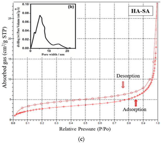 (a) Nitrogen adsorption–desorption isotherm for sample HAP. (b) Nitrogen adsorption–desorption isotherm and pore size distribution of HAP-LA. (c) Nitrogen adsorption–desorption isotherm and pore size distribution of HAP-SA.