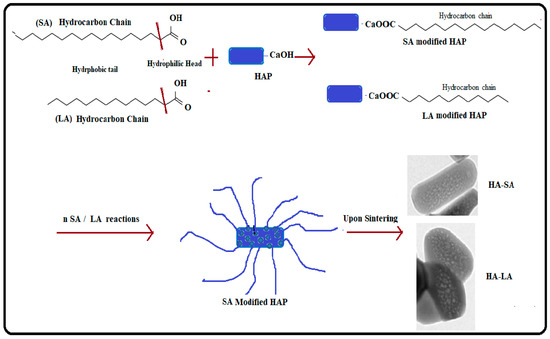 Figure 6 shows the mechanism for the formation of MPHAP using LA and HAP. In the present work, fatty acid molecules were first adsorbed to calcium phosphate precursors via its –OH group. After that, due to the hydrophobic part of molecules, the growth of HAP crystals in the docked area of LA and SA was hampered. A structure surrounding fatty acid molecules continued to form the growth of HAP in another area. The thermal motion of water-insoluble fatty acids was intensified in the sol-gel environment. This triggered the removal of HAP molecules, ensuring that mesopores were established. Thus, the overall functional carboxyl group in fatty acid can promote calcium ion binding (Ca2+) from the carboxylate ion solution for HAP formation. This initiates the growth and nucleation of crystals and therefore helps HAP to improve size-controlled formations [34,35].