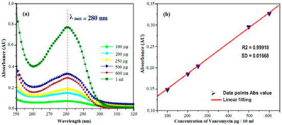 Therefore, using a UV-visible spectrophotometer, a known concentration of (2–10 mg/mL) vancomycin was scanned.