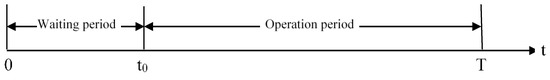 Assuming the remaining lifetime of the coal power plant is T years from time 0, the power plant can invest in the CCUS project as it wishes in any year, (). Supposing the time to construct the CCUS project is not considered, the project can be run immediately when the investment occurs, and it will operate normally until the end of the lifecycle. The timeline of the CCUS project is shown in Figure 1.
