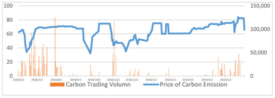 According to the China Carbon Pricing Survey in 2018, the predication of the average carbon price in China is 7.71 USD/ton in 2020, which is supported by the fact that the carbon price in Beijing market is almost maintained above 7.56 USD/ton from June 2018 to May 2019, as shown in Figure 2. Therefore, in this study, the initial price of carbon trading, , was set as 7.56 USD/ton. The currency conversion relation used in this study was 6.6174 CNY to 1 USD, which is the average exchange rate between the two currencies in 2018.