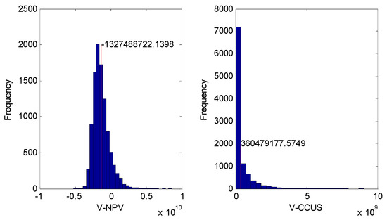 We applied MATLAB software (R2018a, MathWorks Inc., Natick, MA, USA, 2018) to simulate the model and make numerical analysis. In order to improve the convergence and reduce the variance, the dual variable technique was used to ensure the accuracy of the simulation. Basing on 10,000 random paths, the NPV and the investment value of CCUS project were obtained, which are shown in Figure 3.