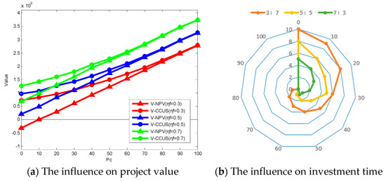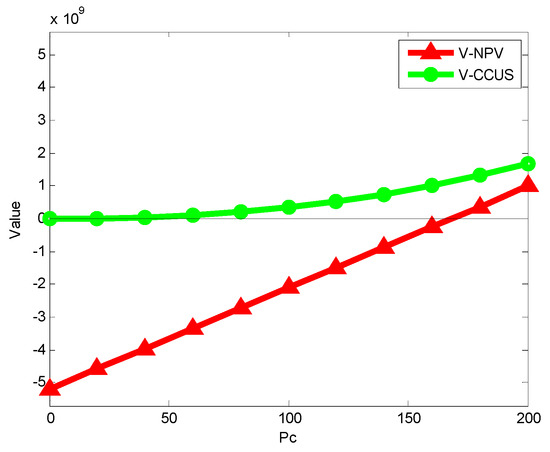 In order to investigate the effectiveness of carbon trading markets, it is assumed that all captured carbon dioxide is sequestered directly, without carbon utilization. In the current conditions of marketing and technologies in China, the impact of the initial carbon price on CCUS project investment is shown in Figure 4. The solid line with triangles describes the NPV value of the CCUS project while the solid line with circles gives the trend of the project investment value. It is assumed that the initial value of the carbon price, which is the current carbon price, changes in the range of below 30.22 USD/ton. With the increase of the carbon price, the net present value of the CCUS project increases continuously. Even though the carbon price reaches 15.11 USD/ton, the net present value of the project is still negative and far below 0. Until the carbon price reaches 25.36 USD/ton, the net present value of the CCUS project can break through zero and become positive. The higher carbon price is unpractical, as the highest price globally in 2018 was only 138.98 CNY/ton, which is 21 USD/ton as the average exchange rate in 2018 was 6.6174 CNY to 1 US dollar. For investors, it seems better to postpone investments under unfavorable conditions and wait for a more suitable opportunity; that is, to exercise the waiting option. The investment value of the project including the waiting option increases with the carbon price, but the rising degree is limited. The waiting options will be more valuable as the market condition becomes more disadvantageous. It is shown by the spacing between the two lines in Figure 4.