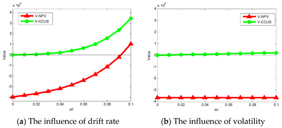 The uncertainty of the carbon price can be reflected by two factors: The expected growth rate and the volatility of the carbon price. Without considering carbon utilization and keeping other parameters unchanged, the impact of carbon price uncertainty on the investment value of the CCUS project is shown in Figure 5.