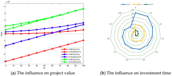 It is assumed that the unit carbon price varies from 0 to 15.11 USD. When the utilization rate , it is shown that investment is immediately infeasible all the way and investment value of the project grows with the carbon price very slowly. When the carbon utilization rate, , rises from 0.1 to 0.3, the immediate investment threshold for CCUS project will fall sharply to 8.37 USD/ton, which seems very easy to realize. Carbon utilization will partially solve the problem of high operational costs in the CCUS project, because it increases revenues and reduces costs at the same time. As a result, the payback period of the initial investment cost of the CCUS project will be shortened significantly. When the carbon utilization rate is , the NPV and investment value of CCUS project increase to a high level, and the project value is more sensitive to the carbon price. Even when the carbon price is rather low, the power plant still has enough motivation to invest immediately.