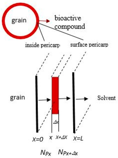 The diffusion from inside the pericarp to the surface of the pericarp is described while using Fick’s Law, as shown in Equation (1) [32].