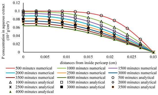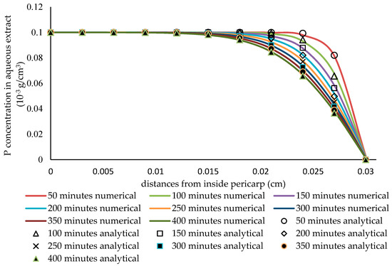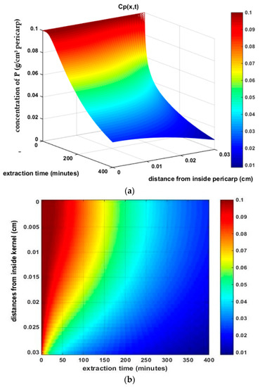 The phytochemical compound that diffused from inside of the pericarp to the surface of the pericarp caused the gradient concentration of P that is shown in Figure 2. In Figure 2, the configuration of the P concentrations (y-axis) that was predicted while using the numerical method in each position from inside the pericarp (x-axis) and at the time of extraction (z-axis) are described by a color gradient. The inside of the pericarp was at x = 0 cm and the pericarp’s surface was at x = 0.03 cm. The diffusion process occurred until a balance was reached between the two phases, at which time the phytochemical had been washed out by the solvent [37].