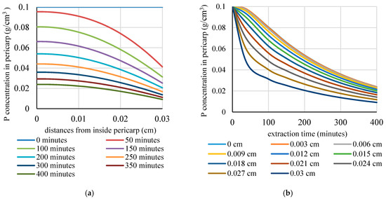 The progress of the extraction process can be more clearly observed in Figure 3, in which the predicted concentration is shown as a function of distance from the inside of the pericarp (Figure 3a) and extraction time (Figure 3b). The information on the remaining P concentration in each part of the pericarp at various time points that is obtained from a simulation is useful in determining the extraction’s efficiency as well as the time when the extraction should be stopped.