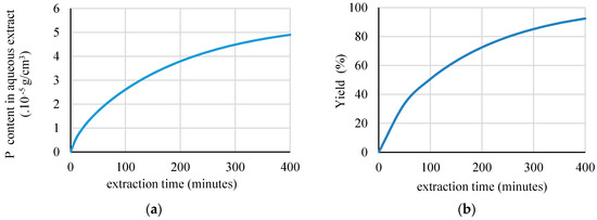 The profile of: (a) P concentration in aqueous extract; and, (b) the yield of extraction as a function of extraction time.
