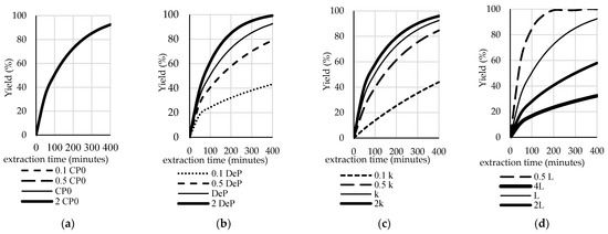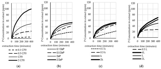 Figure 5a and Figure 6a show the sensitivity analysis of the model as the response to several values of initial P concentration in the pericarp (0.1 CP0, 0.5 CP0, 1 CP0, and 2 CP0). The results show that the P concentration in the extract was very sensitive to CP0. In contrast, CP0 did not significantly affect the yield. Under real conditions, this value depends on the variety of the plant, the location of the crop, and the age of the harvested grain. Figure 5b,c illustrate the sensitivity of the model in predicting the P concentration in extract as the impact of the effective diffusivity value (DeP) and the mass transfer coefficient (kc), respectively, while Figure 6b,c illustrate the sensitivity of the model in predicting the yield as the impact of the effective diffusivity value (DeP) and the mass transfer coefficient (kc), respectively. It can be seen that, as the DeP value and kc value increase, the P concentration in the extract and the yield increase. Similar impacts were observed for kc. Figure 5d and Figure 6d illustrate the sensitivity of the model to the thickness of the pericarp. The occurrence of these phenomena is conceivable, since, the thinner the slab, the faster the diffusion.