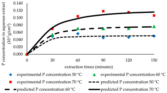 The simulations also predicted the P concentration in the aqueous extract. Figure 4 shows the results. The predicted values are needed to demonstrate the extraction performance in reaching the target of the functional compound during extraction. They show the cumulative amount of active compound that had been transferred into the solvent. Under these conditions, the product’s concentration in the extract rises relatively fast at the early stage of the extraction process and then gradually slows down. It is expected that the value will become constant as the process approaches equilibrium [42].