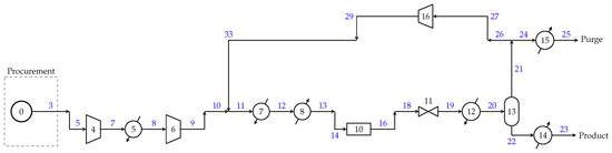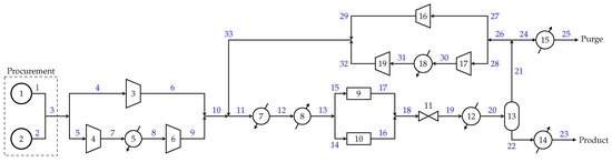 Methanol process flowsheet superstructure, adapted from [22], showing stream numbers in blue.