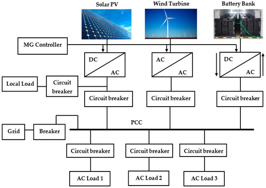 Figure 1 portrays a very general structure of an MG where the DGs (wind and solar in this case), battery banks and loads are connected to the point of common coupling through three-phase circuit breakers. To inject a controlled amount of power at rated voltage and frequency, generally, a controlled non-linear power electronic device is utilized. These devices are non-linear in nature and hence need to be properly controlled in order to achieve a higher power quality along with the proper accomplishment of control objectives such as voltage, frequency and power flow regulation. In grid-connected mode, the sole objective of the MG controller is to ensure proper sharing of power among DGs and between MG and utility grid while in islanded mode the prime control objective is to regulate voltage and frequency at their rated values along with controlled power-sharing among DGs and power quality. Since MG faces more challenges in the islanded mode as compared to that of the grid-connected mode, this research is purely dedicated to the islanded mode of MG operation.